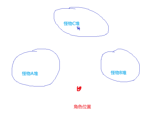 如图所示,正常使用“选怪”命令,会选择离角色最近的区域(A,B)区域的怪。如使用“范围选怪”命令,设置C区坐标点,则会只选择离坐标点最近的怪为目标,从而将A,B区怪一次性拉走