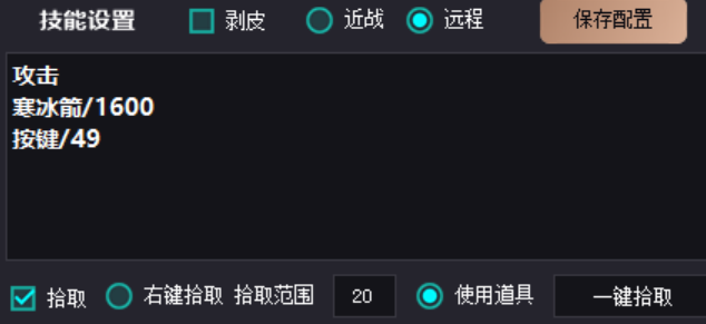 在软件“挂机”界面,根据职业选择“近战”或“远程”,在下面的输入框中,输入反击时所使用的是技能,可直接写技能+延时(毫秒),也可以使用按键模式。反击不支持使用引导类技能,如“暴风雪”。