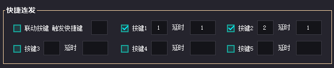 如设置“联动按键”,需要同时设置出发快捷键,如“Q”,并搭配按键1—按键5的设置,那么在游戏中,按住“Q”键不放,则可实现按键1—按键5的技能连发